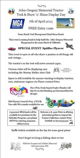 The Nildottie Tractor Drivers, in association with the Nildottie Progress association and the Murray Mallee Auto Club are planning to hold a Tractor Trek and Show ‘n’ Shine display day as fundraisers to assist in the building of the John Gregory Memorial Playground to be located in the main street of Nildottie.
