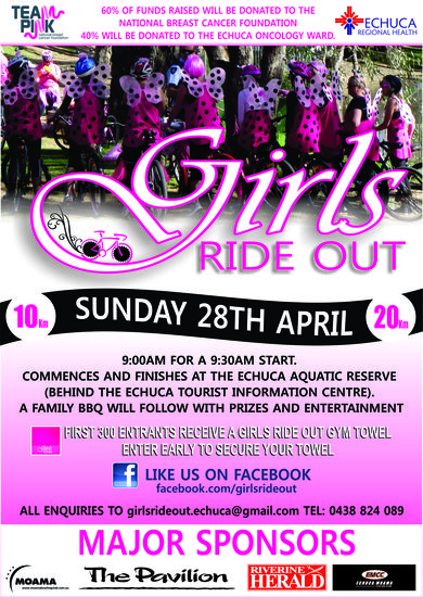 The Girls Ride Out is a pink, family friendly cycling participation event presented by Echuca Moama Cycling Club. The event aims to provide a safe way for families to participate in cycling whilst raising funds for breast cancer research, prevention, support and awareness. Funds raised support National Breast Cancer Foundation and Echuca Regional Health oncology unit.