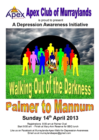 Murraylands Apex Club is hosting a Walk for Depression Awareness on Sunday 14th April 2013. The walk will be from Palmer to Mannum (South Australia). Registrations start from 8 am at the Palmer Oval and will finish at Mary-Ann Reserve in Mannum. A healthy BBQ lunch will be provided along with drinks along the way.