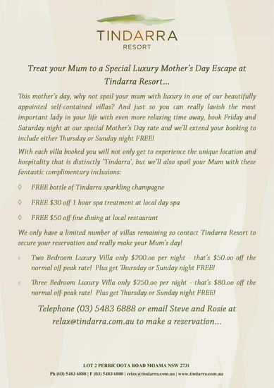 We only have a limited number of villas remaining so contact Tindarra Resort to secure your reservation and really make your Mum’s day!