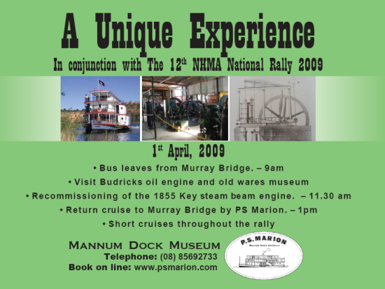 In conjunction with the 12th National Historical Machinery Association National Rally 2009 in Murray Bridge we are offering a package to include the recommissioning of the Key Beam Steam Engine at Mannum Dock Museum at 11:30 am on 1st April 2009. Bus leaves Murray Bridge at 9 am via Olde Ways Olde Days Museum, Long Gully Road Mannum. Return cruise to Murray Bridge by PS Marion departing approx. 1:00 pm 1st April 2009.
