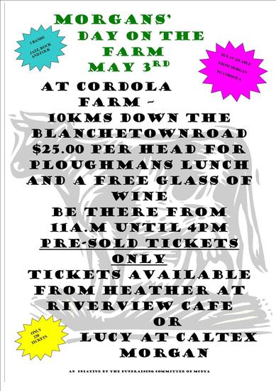 The inaugural Day on the Farm on the river bank of Hauslers Cordola property near Pelican Pointjust out of Morgan is being organised by the events committee of MCDTA (Morgan Community Development and Tourism Association)