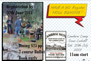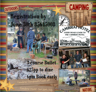 On July 20th Cambrai Hotel will hold the Camp Oven Cook Off! Registrations for participants close on the of 30th June. Or if you just want to enjoy the meals and fun of the cook off get along and enjoy the 3 course buffet for only $25 pp, Buffet starts at 6pm Book Early to secure your spot. PH: 8564 5008