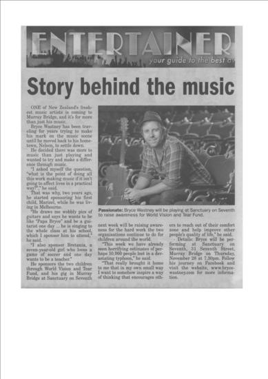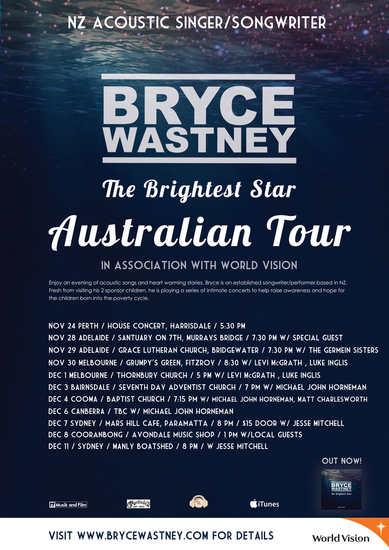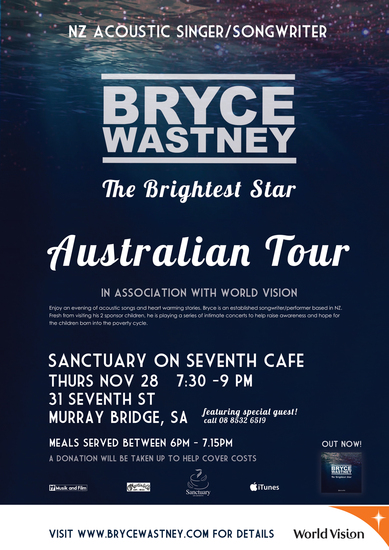 Sanctuary on Seventh is very excited to be hosting NZ Acoustic Singer/ Songwriter Bryce Wastney Thursday November 28th November 7.30pm – 9.00pm. Bryce will be playing at Sanctuary on Seventh to raise awareness for World Vision and Tear Fund – the organisations through which he sponsors two children. One of New Zealand’s freshest music artists, Bryce felt there was more to music than just playing and wanted to try to make a difference through his music. He hopes his music will “….inspire a way of thinking that encourages others to reach out of their comfort zone and help improve other people’s quality of life”. We look forward to welcoming you and Bryce to Sanctuary on Seventh for a special evening of music. Meals will be available between 6.00pm – 7.15pm with the performance commencing at 7.30pm. Please note bookings are essential for both meals and the performance. Please call Sanctuary on 8532 6519 to reserve your seats.