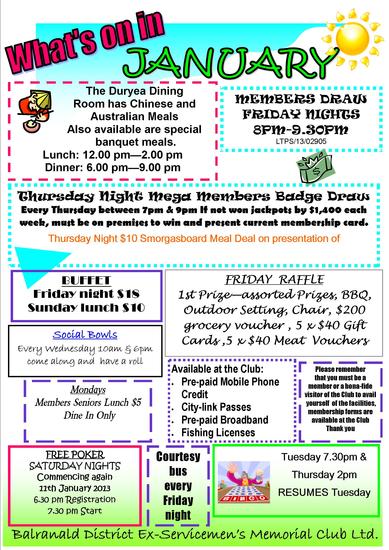 This shows our weekly events and any special functions coming up for the month of January…see you all at Balranald Ex-Servicemen’s Club during the month.