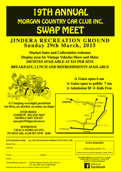 The 19th Annual Jindera Swap Meet, Show N Shine, Vintage Vehicles, Clubs & Enthusiasts Car Display. Hosted by Jindera based CHACA Morgan-Country Car Club, will be held at the Jindera Recreation Ground, 110 Dight St, Jindera NSW only about 15km from Albury-Wodonga, on Sunday 29th March 2015.