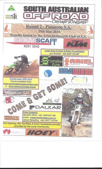 South Australian Off Road Championship Round 2 proudly hoisted by the Ariel Motorcycle Club of SA and their sponsors. Spectators welcome. For those who don’t want to camp accommodation is available at Pinnaroo Motel (08) 8577 8261 or Pinnaroo Cabins (08) 8577 8265. Fuel is available at Mogas Pinnaroo or BP on the Run Pinnaroo.