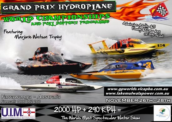 Yarrawonga-Mulwala is proud to present the 2010 UIM World GP Hydroplane Championships. Grand Prix Hydroplanes are the world’s fastest automotive engine circuit race boats, and reach speeds of up to 180mph on inland waterways. Powered by alcohol burning 510ci supercharged Chevrolet engines, this is an event not to be missed.