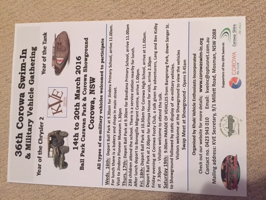 Annually since 1980 military vehicle enthusiasts gather in the town of Corowa and display their privately owned vehicles. This is the largest gathering of vehicles in the Southern Hemisphere. Each year there is a theme. in 2016 it is Year of the Chrysler 2 and Year of the Tank. People with all types of vehicles are encouraged to attend whether they are able to bring a vehicle or not. It was originally organised for people who owned amphibious military vehicles so each year we have vehicles ’swimming in the Murray River. The main days are Friday 18th and Saturday 19th March. On Saturday there is a parade of approximately 200 vehicles down Sanger St and out to the Showgrounds where there is a large Swap Meet. During the week vehicles can be seen in Ball Park Caravan Park and there are trips to Jindera and Bonegilla organised later in the week. Enthusiasts come from all states of Australia and overseas.
