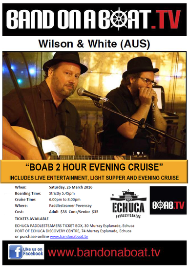 Very exciting – BOAB have been able to secure the infamous Wilson and White blues duo for this Saturday night (Easter Eve), 26 March 2016 for a Special Blues Cruise aboard Paddelesteamer Pevensey!!!
