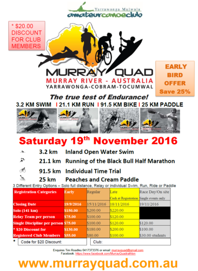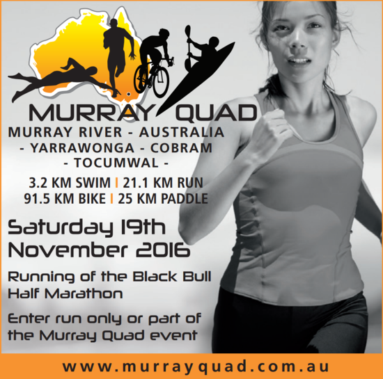 The Murray Quad is a Quadrathlon – a true test of endurance with disciplines in swimming, running cycling and kayaking, basically a triathlon with a paddle leg. The Murray Quad is a unique event that follows Australia’s longest river “The Murray” over a challenging 141 km (88 mile) course from Yarrawonga to Tocumwal. Participants can complete the event solo or as part of a relay team. The individual winner will be crowned the “Australian Diamond Man” and “Australian Diamond Woman”
