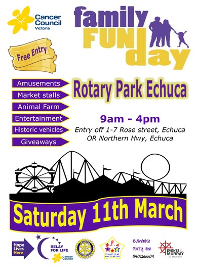 awareness, reach out to the community and its surrounds, have an event that is health smart and family friendly and raise funds to go towards cancer research. The day will include market stalls, amusements,giant games, musicians/singers, heritage vehicles, animal farm and lots more. There will be something for everyone of all ages. Come along and support a great cause.