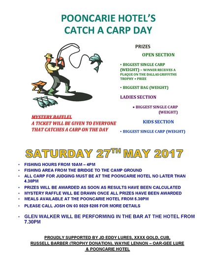 Fishing area will be from the Bridge to the Camp Gound. Open Section, Biggest Bag (weight), Kids Section Biggest single carp (weight). All carp for judging must be at the Pooncarie Hotel no later than 4.30pm. Prizes will be awarded as soon as results have been calculated. There will be a mystery raffle drawn once all prizes have been awarded. A raffle ticket will be given to everyone who cathces a carp on the day. Meals available at the Pooncarie Hotel from 5.30pm. Live music will be performed in the bar at the Pooncarie Hotel from 7.30pm. Event proudly supported by JD Eddy Lures, XXXX Gold, CUB, Russell Barber (Trophy Donation), Wayne Lennon – Oar-Gee Lures, Pooncarie Hotel.
