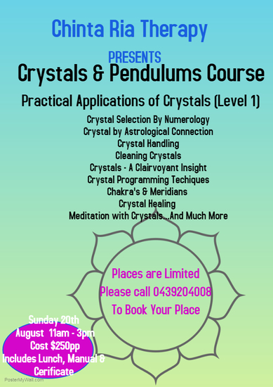 You will Learn Crystal Selection by Numerology, Crystals by Astrological Connection, Crystal Handling, Clearing Crystals, Crystals- a Clairvoyant Insight,Crystal Programming Techniques, Chakras & Meridians….And Much, Much More! Cost Includes Manual, Lunch & Certificate.$250 pp