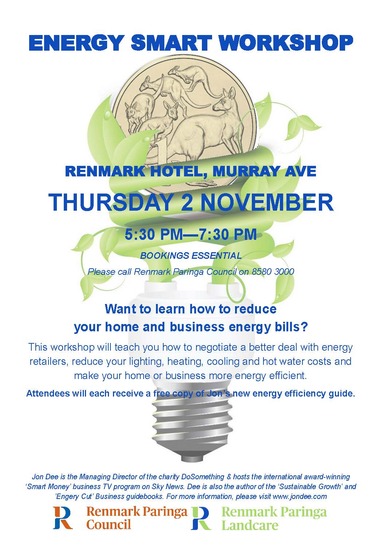 BOOKINGS ESSENTIAL: https://www.eventbrite.com.au/e/energysmart-workshop-tickets-37902476327 OR call Renmark Paringa Council on 8580 3000.