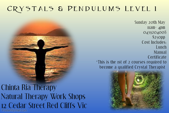 Chinta Ria Therapy Natural Therapy Work Shops is proud to share skills and knowledge spanning over 23+ Years of healing experience in this, the 1st of 2 one day events to become a qualified Crystal Therapist!