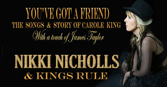 Nikki Nicholls & Kings Rule present ‘You’ve Got a Friend – the songs and story of Carole King with a touch of James Taylor.’ It is a musical journey highlighting Carole’s music that she created not only for herself, but also tunes she wrote for other artists like ‘Chains’ – The Beatles, ’I’m Into Something Good’ – Heman’s Hermits and more. Steve Wade gives us the great music of James Taylor, ‘How sweet it is to be loved by you’, ‘Fire and Rain’ etc.