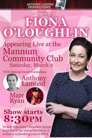 Tickets on Sale Now!! Fiona O’Loughlin and Marc Ryan The Beautiful Bogan bringing the best of the Fringe to Mannum. Saturday March 2nd at the Mannum Club phone (08) 85691010 trybooking.com/BAFYX
