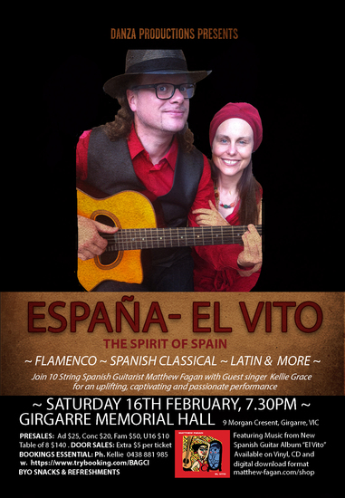 Ten-String guitarist Matthew Fagan aka ‘Lord of the Strings!’ celebrates España, the Spirit of Spain and the Adelaide launch of his vinyl album ‘El Vito’, infusing exhilarating flamenco into Spanish classical masterpieces from Albeniz to Rodrigo. Also featuring South American and Latin music and guest Latin/Bossa Nova Jazz singer Kellie Grace.