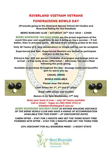 BERRI RIVERSIDE HOLIDAY PARK are the proud organisers of the Riverland Vietnam Veterans Fundraising Bowls Day this year and would love to see it being as big a success – if not better, than in previous years.