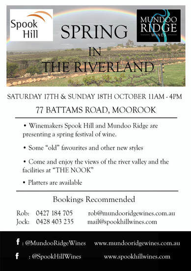 Join Winemakers Spook Hill and Mundoo Ridge as they present a Spring festival of wine, Saturday 17th & Sunday 18th October 2020 11am to 4pm.