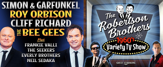 Geoff and Ben Robertson are back as your charming and cheeky hosts for this nostalgic night of entertainment as they pay tribute to the musical giants of the 1960’s – The Bee Gees, Simon & Garfunkel, Roy Orbison, Cliff Richard & The Shadows, Frankie Valli, The Everly Brothers, Neil Sedaka and The Seekers.