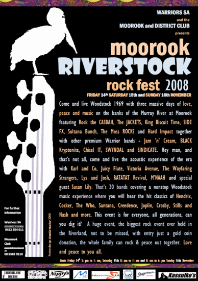 3 days of peace love and music a la Woodstock 1969 featuring bands from the Warriors Music Association. There will be two stages, one for main performances and an acoustic stage. There will also be acoustic performances in the Moorook and Districts Club. Come and hear covers of Hendrix, The Who, Cream, Canned Heat, Paul Butterfield and many more. This is a community event which will see a wide array of food and beverages on sale. Bring your camping chair!