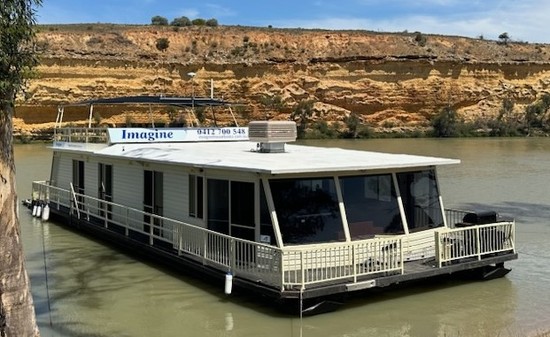 Imagine has four spacious bedrooms, two with ensuite bathrooms and two with a shared ensuite gives that extra touch of privacy. The rear lounge converts to a fifth bedroom making Imagine an ten berth boat without someone having to sleep in the front lounge. All bedrooms have a deck access door. A roomy front lounge area has TV, VCR, DVD and CD player and a sumptuous leather lounge suite and the rear lounge a TV and VCR. A swim deck, canopied upper deck, ski boat hitch, ice box, gourmet BBQ, Laundry and kitchen with a dishwasher, microwave and refrigeration makes the treat complete. Imagine handles very well, is economical, air conditioned and gas heated for your comfort. Relax and enjoy.