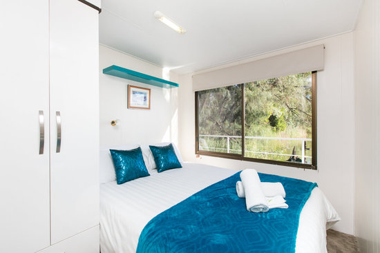Albert James houseboat is the small silver spa houseboat of the fleet. A great family houseboat, it is also popular with couples and honeymooners who take advantage of the four person heated rooftop spa. Albert James has two queen bedrooms (only 1 can be split to single beds if required) and a bunk room for two people. There is also a double fold out sofa bed in the front and rear lounges. The houseboat has two toilets, one bathroom and a well equipped kitchen with gas fridge, conventional stove, hotplates, pod coffee machine and a microwave oven. Albert James has recently had a new kitchen with a dishwasher fitted, as well as a new vanity in the bathroom and a complete refresh. The front lounge area has a flat screen TV while the rear lounge is a great spot to escape with a book to relax on a sunny afternoon. Choose to dine indoors or upstairs on the shaded rooftop. There is a CD and DVD player on board, as well as books, magazines and board games. Do as much or as little as you please! For your comfort the houseboat has gas heating in the cooler months and evaporative cooling in summer, 12 volt lighting and an easy start generator. There is even a shower on the swim deck to rinse off after watersports or fishing. Albert James is powered by a 60hp Mercury 4 stroke outboard motor and is very easy to operate and moor for two or more people. Sleeping a maximum of 10 people, we recommend this houseboat for 2-6 people for maximum comfort. Please note this houseboat is not suitable for sleep apnea machines. This houseboat is pet friendly by arrangement, there is a pet fee of $50 per animal which will be charged on booking.