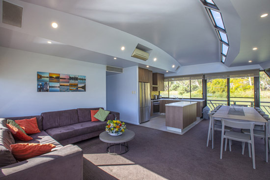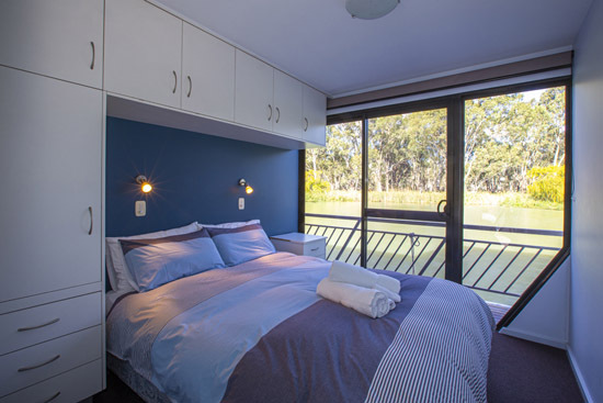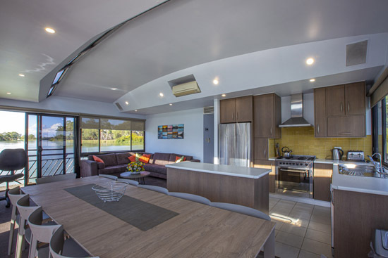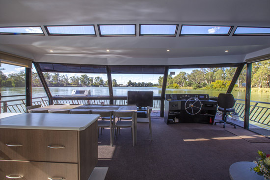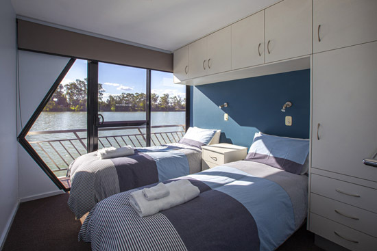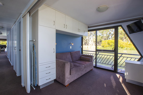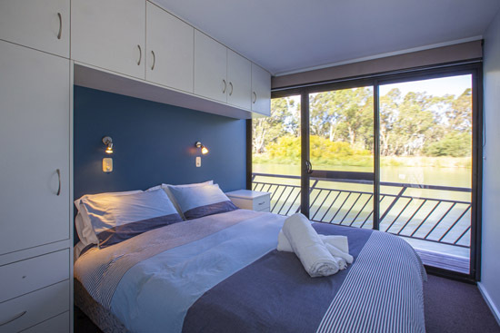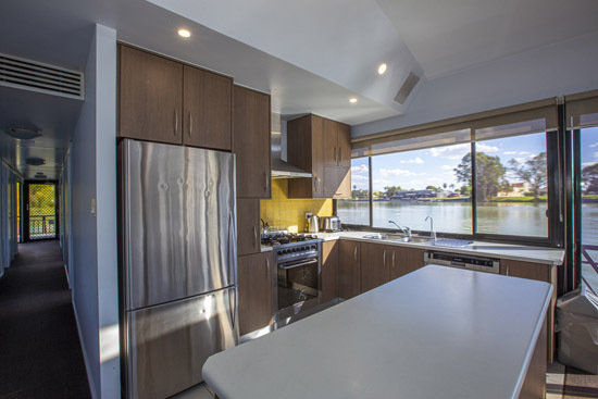 Riverstar has a spacious living area with a large corner lounge suite to sit back relax and enjoy the beautiful views of the Murray. This area has reverse cycle air-conditioning for your added comfort in summer and winter. The well equipped gourmet kitchen which includes a gas/electric stove, microwave, dishwasher plus plenty of crockery and cookware and all the other items needed to prepare and cater to all your holiday meals. The changing scenery through the panoramic tinted windows whilst in the kitchen will make meal times even more pleasurable and never boring.