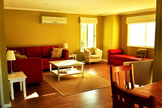 The 3 bedroom cottage has been cleverly designed to accommodate your every need. With flexibility in the sleeping arrangements, it caters brilliantly for families, couples, singles or groups (with or without other cottages). Each bedroom has a King sized bed which can be split to 2 singles, with 2 of the bedrooms taking 3 singles if required. The cottage also contains 3 bathrooms to give you maximum comfort. Featuring a huge living area and kitchen/meals area, it is ideal for entertaining. Another feature of the cottage is the ability to divide it into 2 separate cottages, each with its own carport and entrance. One end becomes a 2 bedroom, 2 bathroom cottage with the large living/kitchen area, while the other end becomes a fully self-contained 1 bedroom, 1 bathroom cottage with its own living/kitchen area. We can also close off the back bathroom and living area, making it 3 bedrooms/2 bathroms/1 living area. Open it up and use it all, or close it off and use only part. Facilities in the 3 bedroom cottage include: • 3 bathrooms • Huge living area in main part of cottage • Generous sized meals area with table to comfortably seat 8 • Fully equipped kitchen to cover all your self-catering needs • Second living area with TV and kitchen/meals area • 2 split system air conditioner/heaters • All linen provided • 2 covered carports • Washing machine and dryer • Large private paved patio with BBQ & outdoor setting