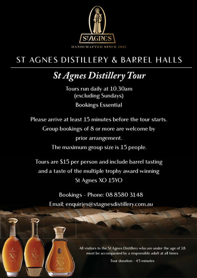 Tours are $15.00 per person and include barrel tasting and a taste of the multiple trophy award winning St Agnes XO 15YO.