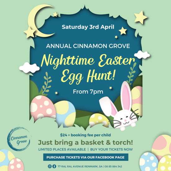 Come and join us for the annual Cinnamon Grove Nighttime Easter Egg Hunt. When the sun goes down our garden turns into a magical and mystical wonderland, with Easter Egg treats hidden for your little ones to set out and discover. Your entry and ticket includes an abundance of Easter Eggs and goodies, a hunt map so you know where to find them, with clues and hints mapped out to make the experience a true adventure + a few other goodies.