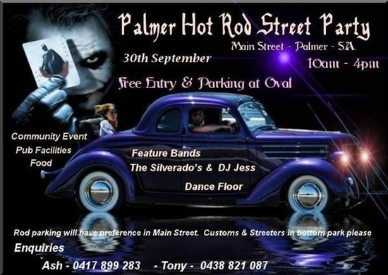 Sep 30 Palmer Hot Rod Street Party SA, 10am-4pm, Palmer Main Street. Feat bands: The Silverados and DJ Jess. FREE entry and parking at oval, community event so get in early. Rod parking in main street, Customs and Streeters bottom park. Contact Ash 0417899283 or Tony 0438821087 for more info.