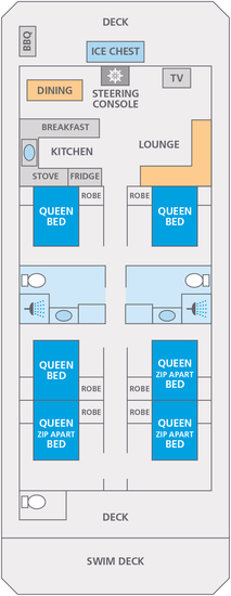 Break Free has had a major refurbishment modernising her look, kitchen cabinet upgrade including new appliances, new carpet throughout, new L-shaped lounge, smart TV, Wi-Fi, fresh paint, solar panels assisting the fully automated electrical system on board, outdoor carpet upstairs, outdoor furniture upstairs replaced, new air conditioning and all new bedding.