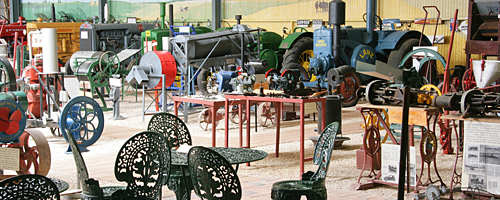 The Gum Family Collection consists of restored stationary engines, tractors, farm and household memorabilia, backed by a panoramic Mallee mural.