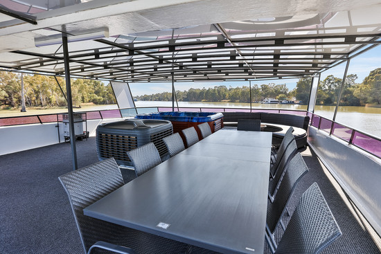 Hypnotic is a 12 berth platinum spa houseboat with great indoor and outdoor living areas. The houseboat has 6 queen bedrooms, all of which can be split to singles. The bedrooms have power points for sleep apnea machines if required. Every bedroom has large windows to accentuate the amazing river views. There are two shared bathrooms boasting instant hot water to the showers, (with standard flush toilets, not marine toilets) which can be accessed from the hallway. There is a third toilet on the rear deck. The kitchen is located at the front of the houseboat and has a stainless steel fridge/freezer, dishwasher, stove, microwave and pull out spice rack. There is a barbecue on the front deck, allowing easy access to the kitchen. The spacious front lounge with comfortable large sofa and flat screen TV is opposite the dining area, and boasts a bar with built- in bar fridge. There is a DVD and CD player with MP3, USB and Bluetooth connectivity with surround system which is piped to the rear and upper decks. The rear TV lounge has a queen bed and privacy divider, with a power point for sleep apnea machines if required. For your comfort there is evaporative air conditioning in the living area and ducted to all bedrooms, as well as gas heating in the cooler months. The top loading washing machine and dryer are located in the hallway. The impressive solid rooftop has a spa, outdoor dining table and chairs, luxurious lounge suite, and sunbeds. The large swim deck has two V hitches for your ski boat. The houseboat has 24/7 240 volt power, no starting the generator, with an impressive solar bank to reduce running costs, and is powered by 2 economical 4 stroke Yamaha outboard motors. Hypnotic sleeps a maximum of 12 people on board. This houseboat is not pet friendly.