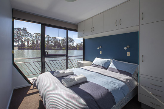 Riverstar has a spacious living area with a large corner lounge suite to sit back relax and enjoy the beautiful views of the Murray. This area has reverse cycle air-conditioning for your added comfort in summer and winter. The well equipped gourmet kitchen which includes a gas/electric stove, microwave, dishwasher plus plenty of crockery and cookware and all the other items needed to prepare and cater to all your holiday meals. The changing scenery through the panoramic tinted windows whilst in the kitchen will make meal times even more pleasurable and never boring.