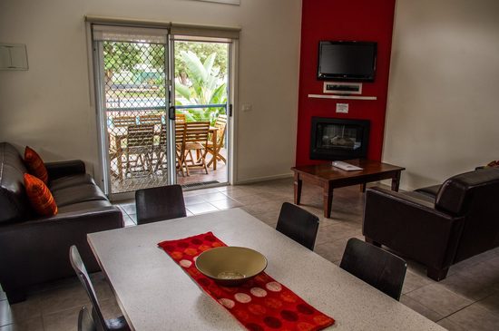 Overlooking the pool area perfect for al fresco living. Luxuriously appointed with 2 bedrooms (both queen beds, one with 2 bunks), all linen & towels provided, gas log fire, rev cycle aircon, large LCD TV with DVD, LCD TV in main bedroom, gourmet kitchen with dishwasher, laundry, large veranda and sun deck, BBQ and more.