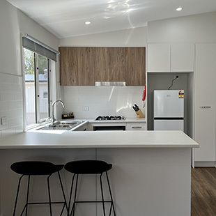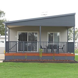 Our NEWLY BUILT Standard Cabins provide a modern, comfortable stay with park views. Sleeping up to 6 guests, there are 2 bedrooms featuring a queen bed in one room and 2 sets of bunks in the other. These cabins are fully self-contained with open plan living, a well-appointed kitchen, deck with outdoor dining and two toilets. Our Standard Cabins are perfect for small families and travelling workers who want to stay a bit longer with comfort and affordability.